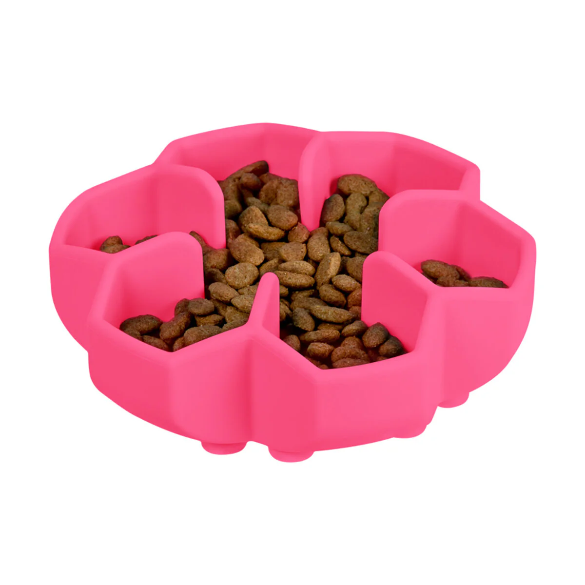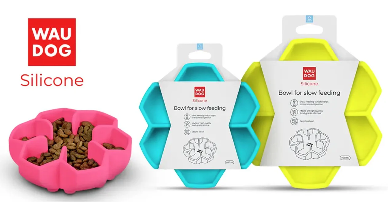 A slow feeder, like the WauDog Silicone Bowl, is an obstacle course. It has raised ridges and valleys that force the dog to use their tongue and lips to work the food out.